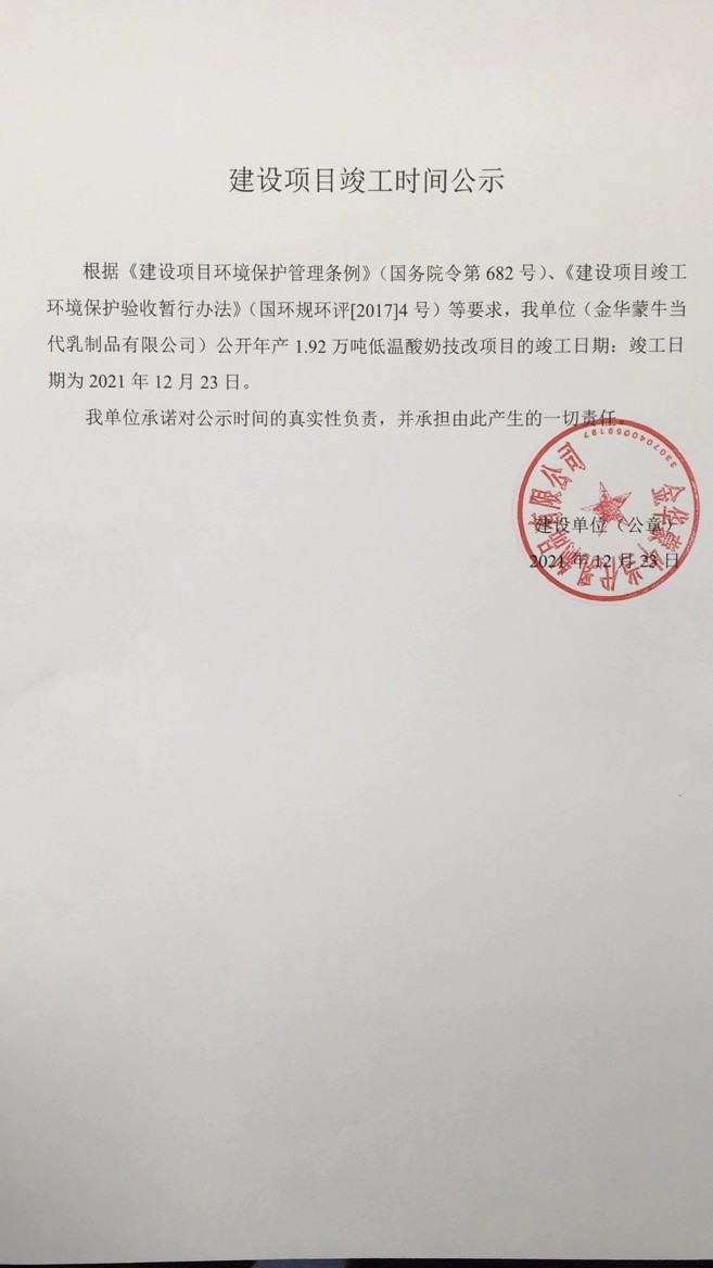 金華蒙牛當代乳制品有限公司年產1.92萬噸低溫酸奶技改項目竣工、調試時間公示