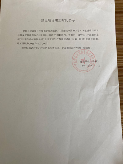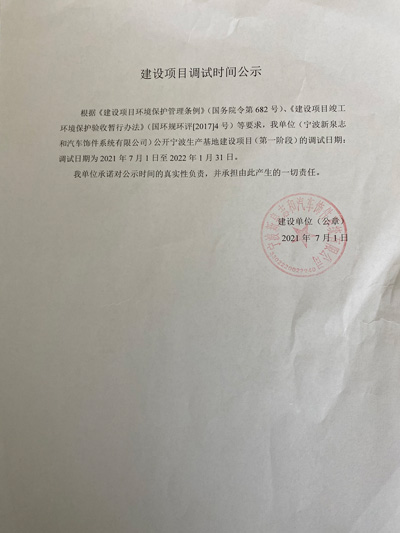 寧波新泉志和汽車飾件系統有限公司寧波生產基地建設項目(第一階段)竣工、調試時間公示