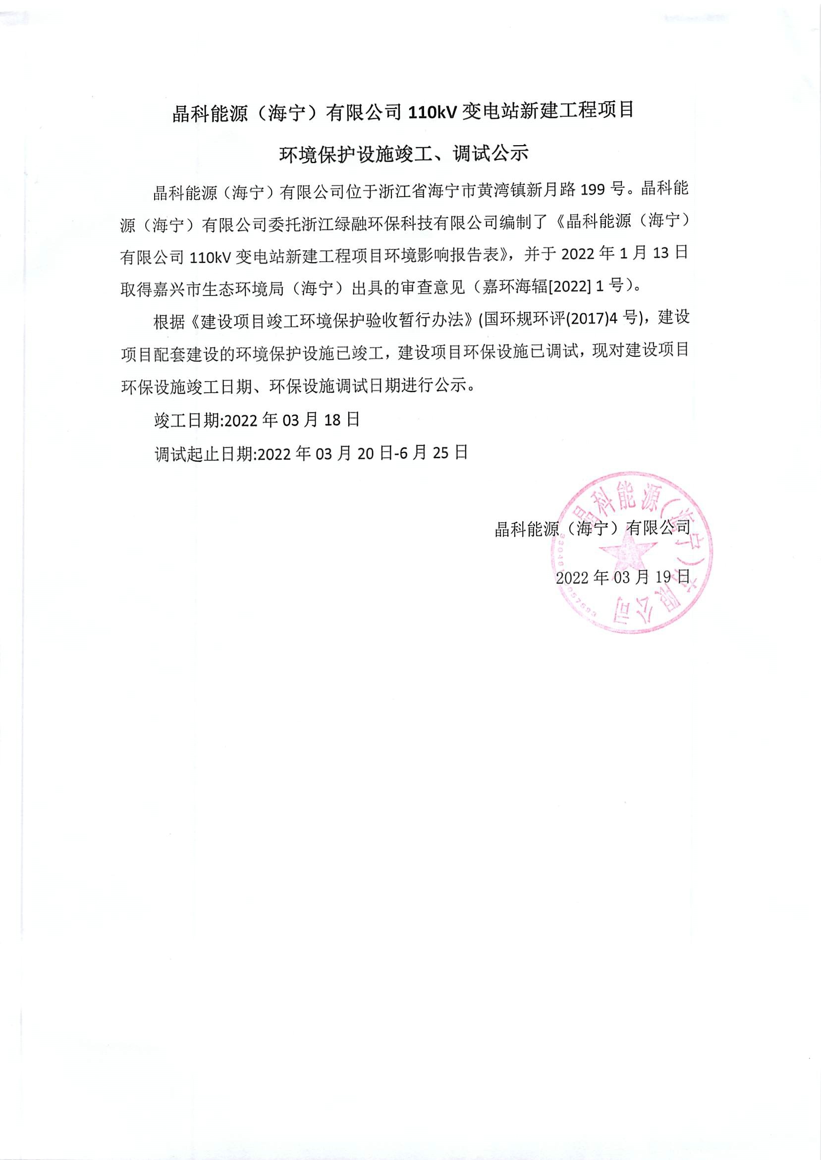 晶科能源(海寧)有限公司110kV 變電站新建工程項目環保設施竣工、調試公示