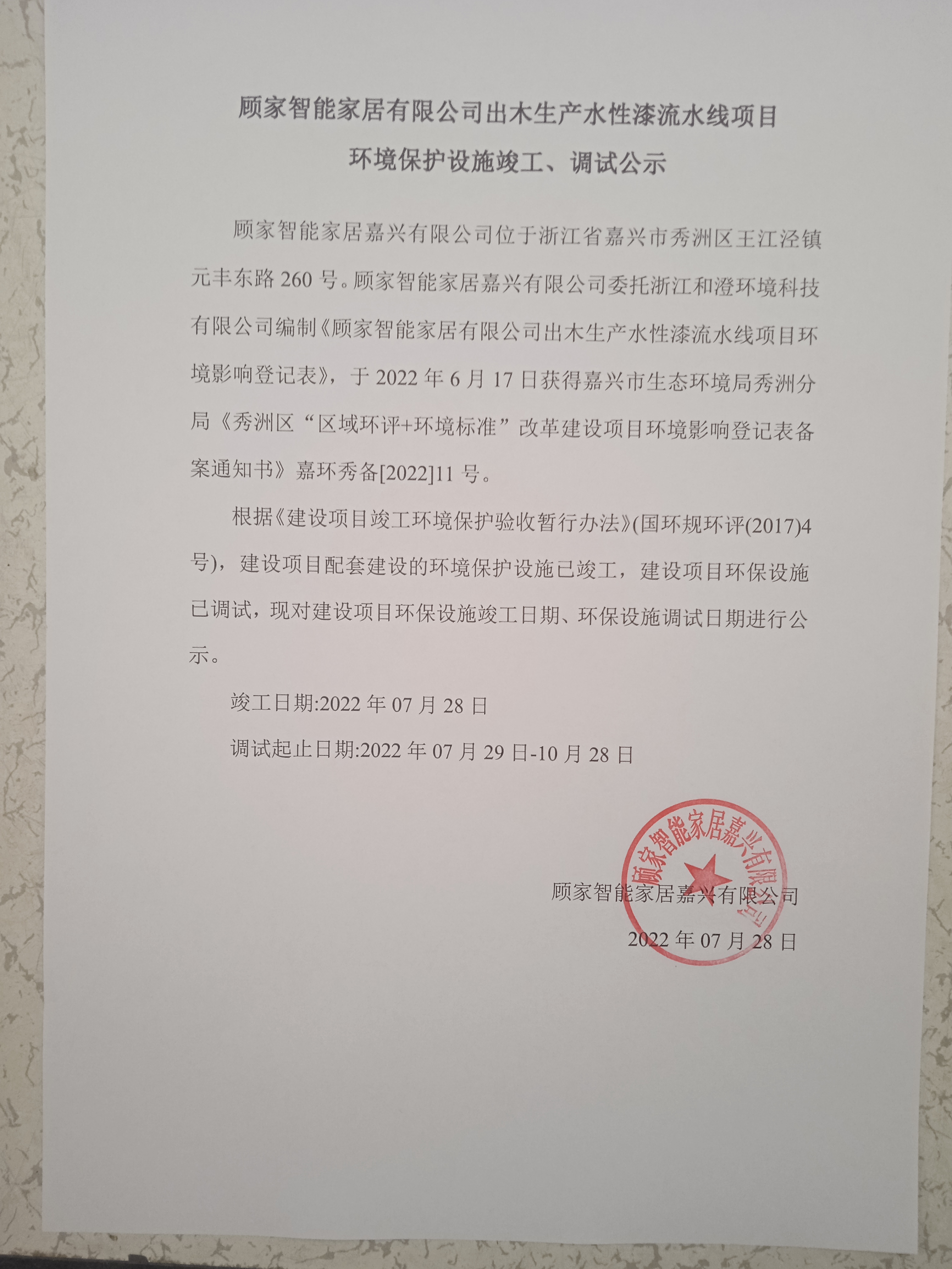 顧家智能家居有限公司出木生產水性漆流水線項目環保設施竣工、調試公示