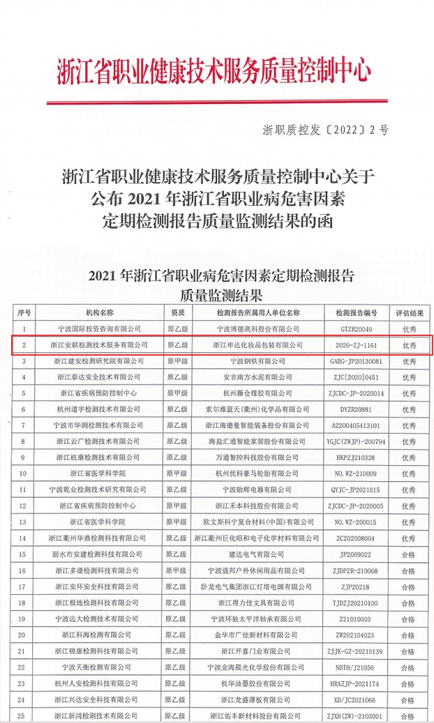 安聯檢測在浙江省職業健康技術服務質量控制中心組織開展的“2021年度浙江省職業病危害因素定期檢測報告質量監測工作”中,從全省47家職業衛生技術服務機構(5家原甲級機構和42家原乙級機構)脫穎而出,抽查評價結果為優秀。