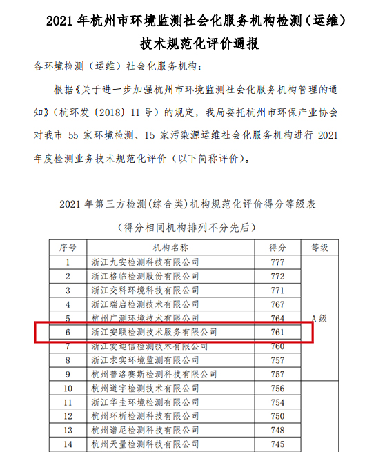 安聯檢測在“2021年度檢測業務技術規范化評價”工作中再傳捷報,取得A級(761分)的好成績,在45家檢測機構中名列第六。