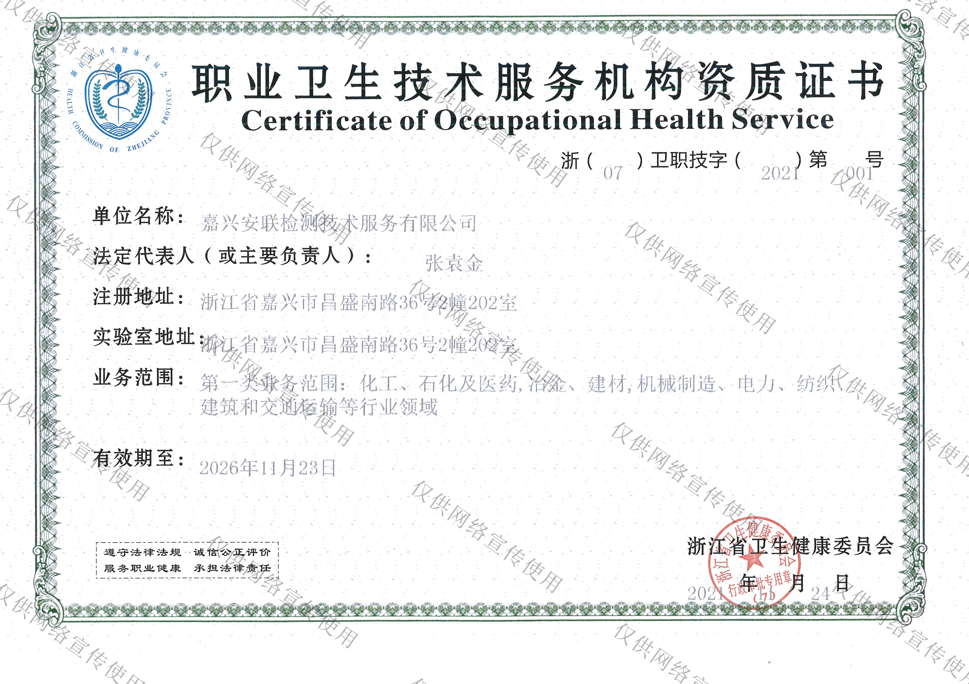 喜訊:嘉興安聯順利取得《職業衛生技術服務機構資質證書》!